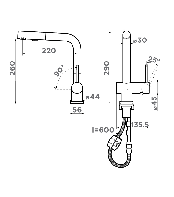 - Практичный однорычажный смеситель выполнен в современном стиле и снабжен высоким поворотным изливом и вытяжным шлангом.