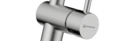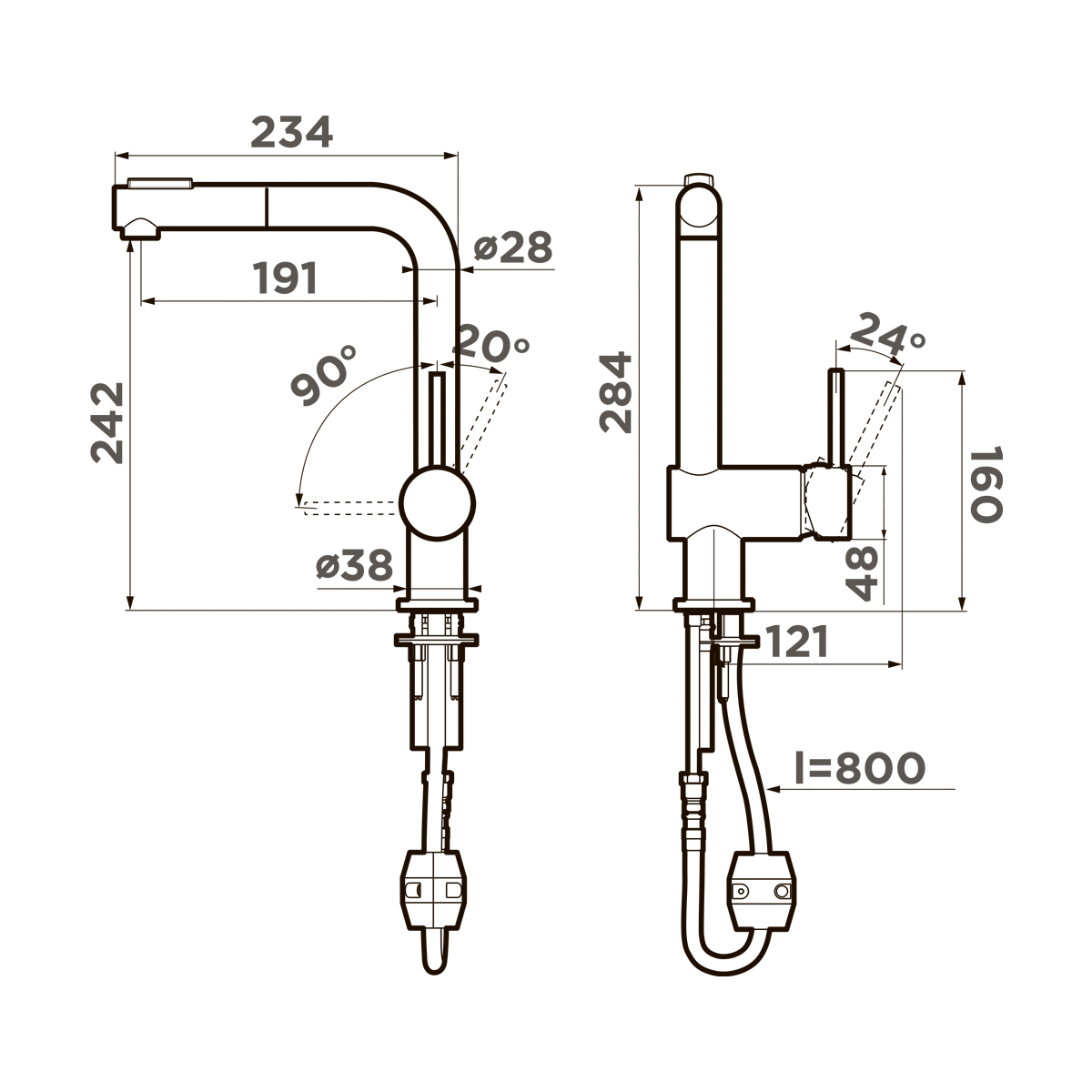 - Практичный однорычажный смеситель выполнен в современном стиле и снабжен высоким поворотным изливом и вытяжным шлангом.